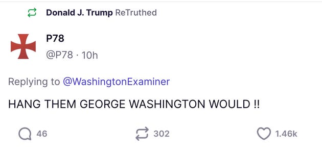 Donald Trump’s allies may argue that the President was not encouraging violence against his political opponents. That he was, in fact, criticizing what he sees as a usurpation of lawful executive authority. Never mind that Trump has repeatedly demonstrated a cavalier attitude toward the law and its value. Trump’s own social media demonstrates the flimsiness and absurdity of this argument. For one, Trump reposted another user’s statement, saying, “HANG THEM LIKE GEORGE WASHINGTON WOULD!!”