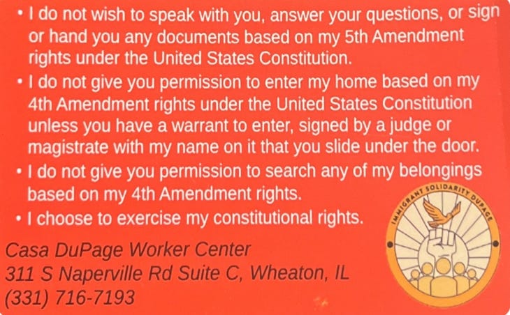 As I mentioned before, many Americans feel they have no means to make their voices heard or to organize, but while I was outside, I met numerous people who not only shared their experiences and motivations for opposing the administration, but also organized within their local community. One gentleman even handed me a series of cards with useful responses for dealing with ICE in the event of a confrontation. These ‘know your rights’ cards are part of a larger movement in my area called Immigrant Solidarity DuPage, which seeks to “Educate, organize, and mobilize DuPage County around the rights and collective struggles of the Latino community.”